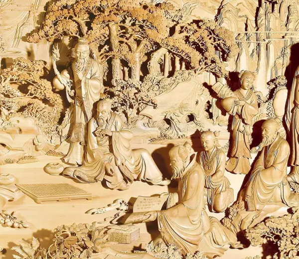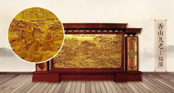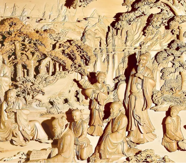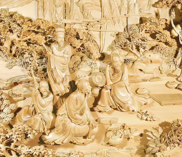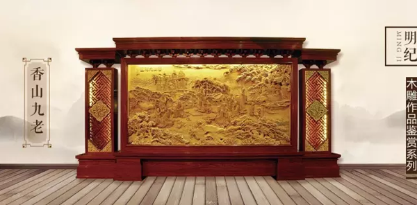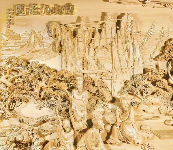 作品运用传统东阳木雕中的迭雕技法,取平远视角,分远、中、近三层次。远景层峦迭嶂,莽莽苍苍;中景松柏茂郁,藤萝生阴;近景则是九位雅士。