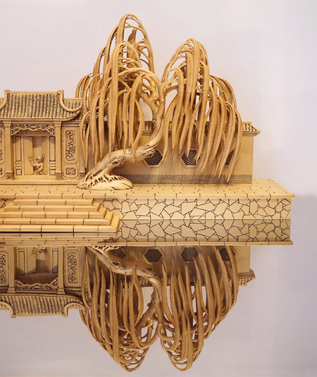 中国工艺美术大师黄小明大师徜徉其间,在众多珍贵的古代艺术品中,感叹先人的睿智才华与艺术灵光,赏玩之际,致敬工美大师张成与杨茂,遂创作出印象木雕系列——春意,竹韵与船影。