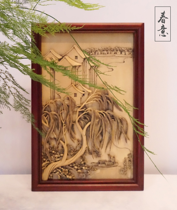 烟雨西塘,是温婉江南的典型代表。杨枊、白墙青瓦、流水、乌篷船,这些最“江南”的元素,在黄小明大师的刻刀下,呈现出一幅立体的诗画。写意与具象,中式审美的两重意味主次分明实现了铺阵。让袅袅蔓延的柳树,与高耸的白墙青瓦占据画面重心,曲与直、柔顺与刚硬、曼妙与挺拔,两种相对的美感有序而互不打扰。这种秩序感在构成画面的平衡的同时,也不打扰创作者的灵性抒发。墙间稍稍一缀的小轩窗,角落停驻的乌篷船、盛放的小花,远处隐现的水岸人家,悠悠然就把江南的春意与杨柳白墙完美地融合起来。