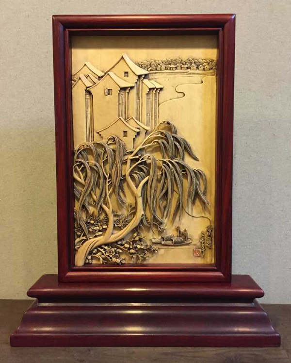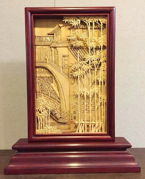 浙江省工美中青年大师委员会会长黄小明代表中青委向西塘管委会捐赠了三件作品,分别是黄小明大师的作品《竹韵》,吴尧辉大师的作品《水乡渔歌》以及哀警卫大师的作品《江南岸——西塘》。