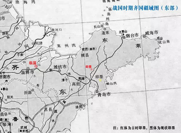 战国时期齐国疆域图(东部),注:红体为古时即墨,黑体为现状即墨(标注版)