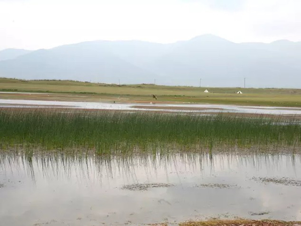经过一片湖水旁边,我被湖面上的风景所吸引,正准备下车休息片刻,便看见在湖的对岸搭着几个带烟囱的小帐篷,从烟囱中升起袅袅的炊烟。这种帐篷并不像蒙古包那么大,应该是牧民临时休息的场所。