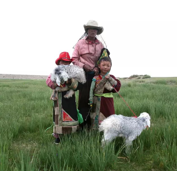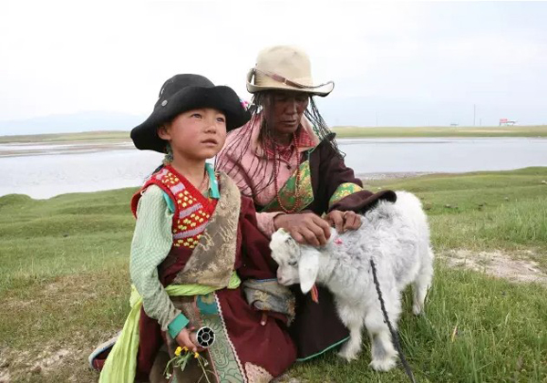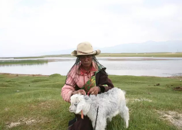 我沿着湖边走过去想一探究竟,很快便看到一位当地女性在正在离帐篷不远处放牧,她头戴草帽,身披富有民族特色的藏袍,在她的身边,皮肤黝黑却透射着活力。在她的身边,两个孩子各自牵着小羊羔,不断地相互嬉闹,从年龄上判断,女人一定是两位孩子的母亲。