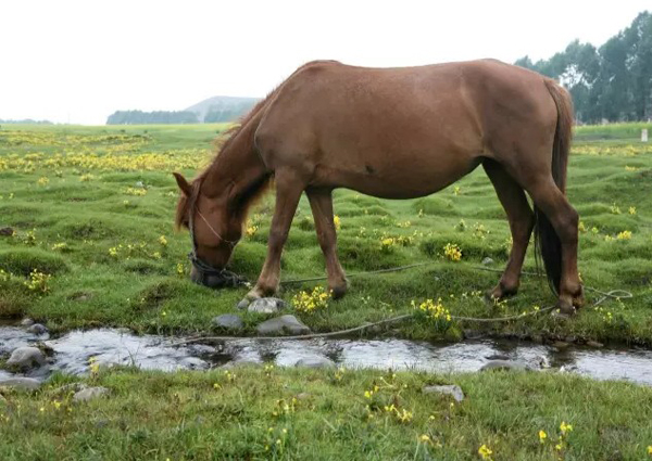在大片的油菜花海中,远远地出现几个黑点,乍一看以为是在田间劳作的农民,走进一看,原来是在一盘草地上吃草的牛羊和马匹。在一条小溪流的旁边,我近距离地观察一匹健硕的马,对于我的到来它一点也不惊讶,而是仍然埋头于吃草。