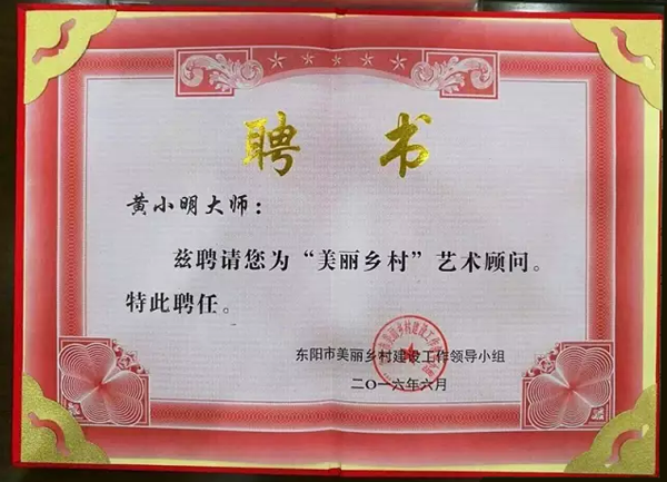 时至今日,为了增强东阳的人文内涵、深化现代手工业发展体系,东阳市美丽乡村建设工作领导小组特意聘请了中国工艺美术大师黄小明出任“美丽乡村艺术顾问”。6月30日下午,东阳市行政中心会议室,受聘会正如火如荼的召开着,土生土长的东阳人黄小明十分高兴的接过了受聘证书,并表示能担任这个艺术顾问是他的荣幸,他也将继续为东阳市的建设发展做出更多的贡献!