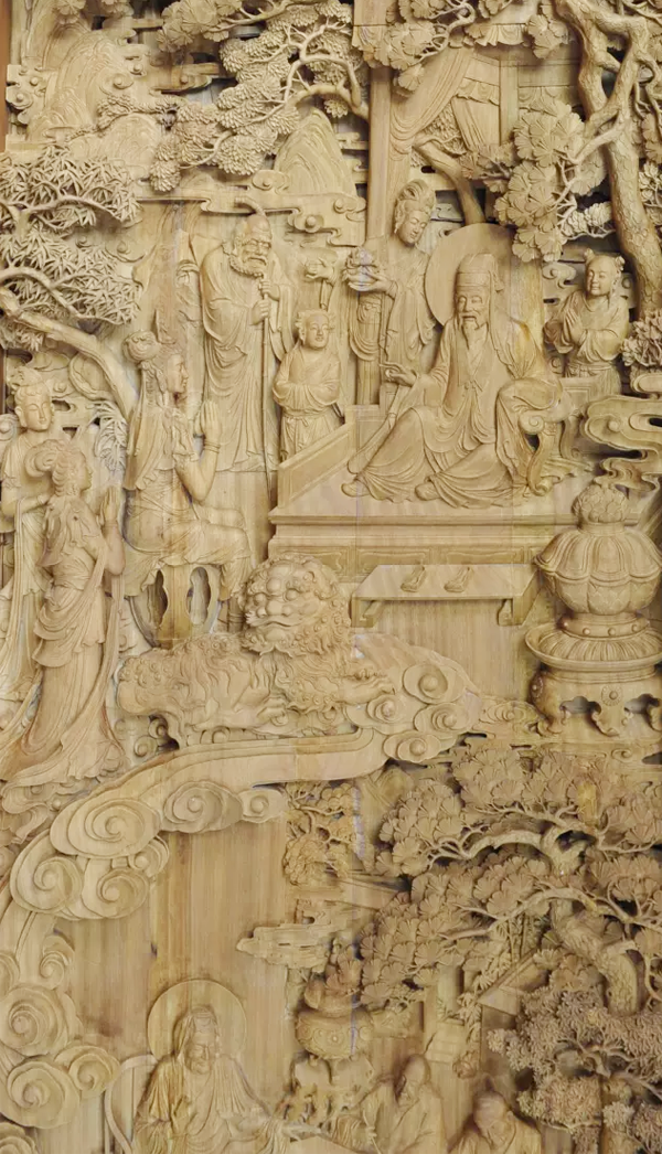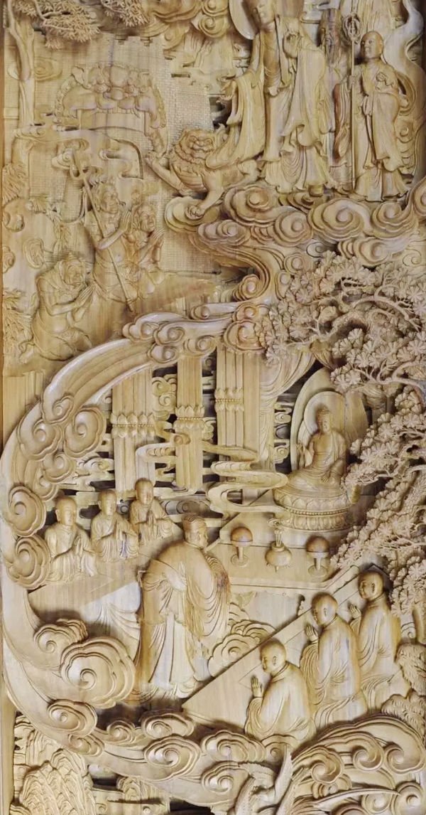 八福壁挂的创作以定、愿、慧、悲、慈、戒、行、信为题材进行了,将东阳木雕的艺术精髓与佛理进行了巧妙的融合。