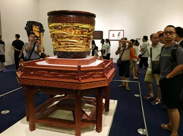作为工艺美术界极具代表性的东阳木雕技艺,发源于商周,滋长于秦汉,形成于唐宋,成熟于明清,历经数千年锤炼,是中国工艺美术百花园中的一朵奇葩,因此在本次展览中自然少不了它的席位。中国工艺美术大师、东阳木雕代表性传承人黄小明大师携带着他的东阳木雕力作《金龙聚宝》参加本次展览,吸引了众多参观者的目光。