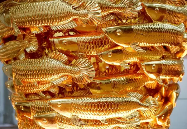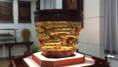 台座内的自控装置能使台面带着聚宝盆缓缓旋转,24K贴金的金龙鱼随之摇首摆尾,流光溢彩,美不胜收。