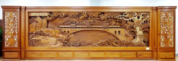 黄大师介绍说,这件作品与贵阳市还有一定的渊源,作品雕刻画面中的“风雨桥”原型正是贵阳地区所独有的文物遗产“侗乡风雨桥”。