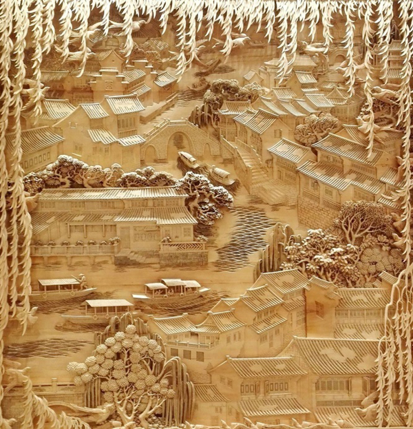 《忆江南》作品采用椴木材质,色微黄呈现白色,在色彩方面更易表现出清晨的江南水乡笼罩在氤氲雾霭中的景象。而椴木材质轻软细密,文理通直均匀有绢丝光泽,适宜精雕细刻,更好地刻画出了古朴的石桥、依依的柳条,以及水面的船只等富含江南水乡意味的代表性元素。