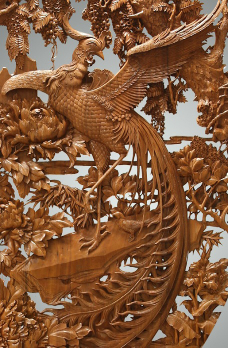 作品材质选用了号称缅甸国宝的柚木,柚木号称“万木之王”,材质的特性与作品表达的主题相得益彰。柚木油脂丰富,散发金黄色光泽,用于表现凤凰的高贵与气质可谓是不二之选。此件作品中,作者采用了东阳木雕中双面镂空雕的技法,使作品所表现元素的立体感更为强烈,大大增强了作品的观赏性。