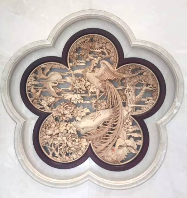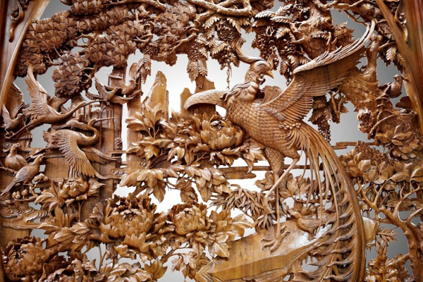 《丹凤朝阳》之中,松荫如盖,牡丹铺锦,一片花团锦簇的春色中,百鸟翩翩来朝,流光溢彩的丹凤犹如朝阳,王者气势,不怒自威。繁复富丽的画面元素,黄小明大师却选择用东阳木雕的镂空雕技法予以表现,其难度不言自明。
