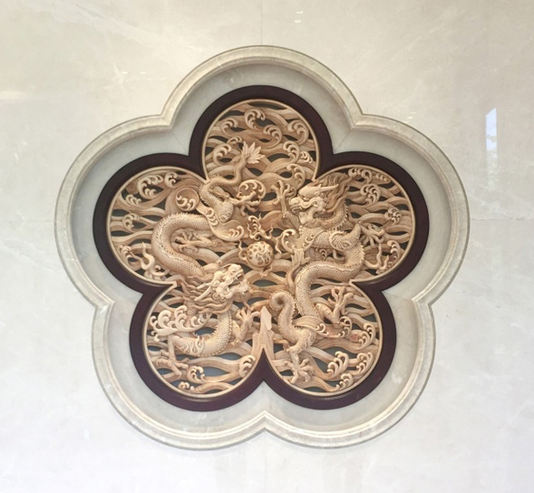 两件作品均以梅花造型呈现,圆润而优雅,寓意吉祥如意。精美绝伦的东阳木雕工艺,古色古香的文化气息,置身于西湖国宾馆之中,有一种中国文人湖边雅聚的悠然之感,让国际友人也实实在在地体会了一把中国式的雅致生活。