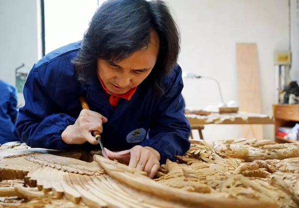用作于招待G20峰会各国政要的西湖国宾馆宴会厅内,黄小明大师以精美木雕元素将大厅装点一新,《双龙戏珠》、《丹凤朝阳》等吉祥图案以木雕的形式被精彩演绎,赏心悦目的同时,营造了祥和、温馨的宴会氛围。