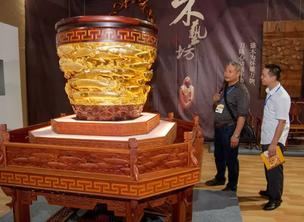 《金龙聚宝》作品以金龙鱼为元素,以椴木和大红酸枝为主体材料,结合木雕与竹丝镶嵌等工艺打造而成。