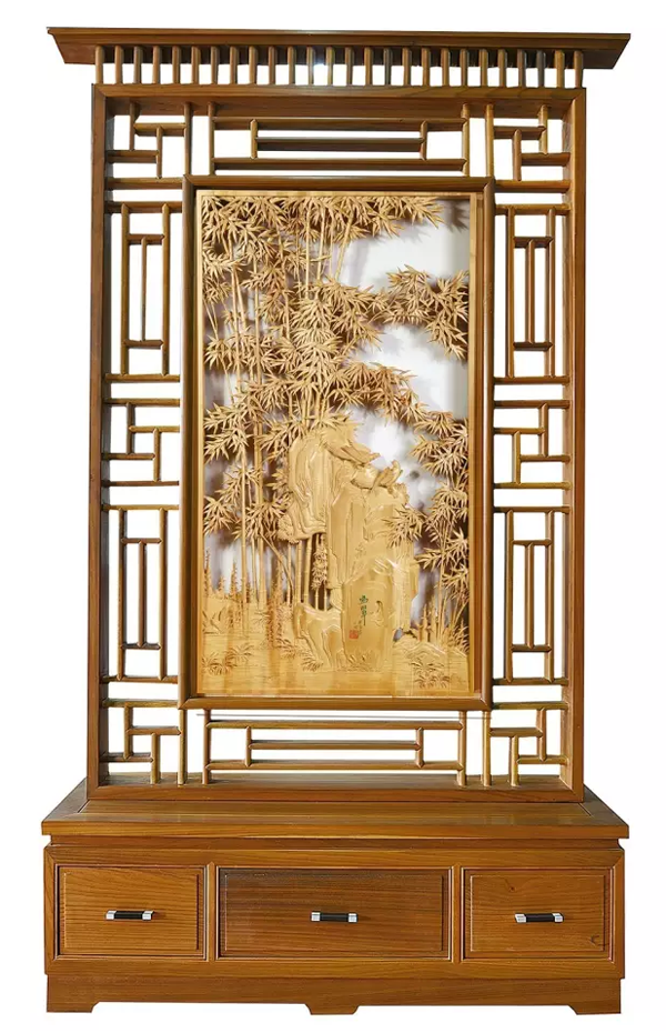 作为空间隔断所用的小型立屏,《鸣翠》充分借鉴了中国传统剪纸艺术,用东阳木雕透空雕技法,把茂密的修篁处理得疏而不漏,空灵秀气。