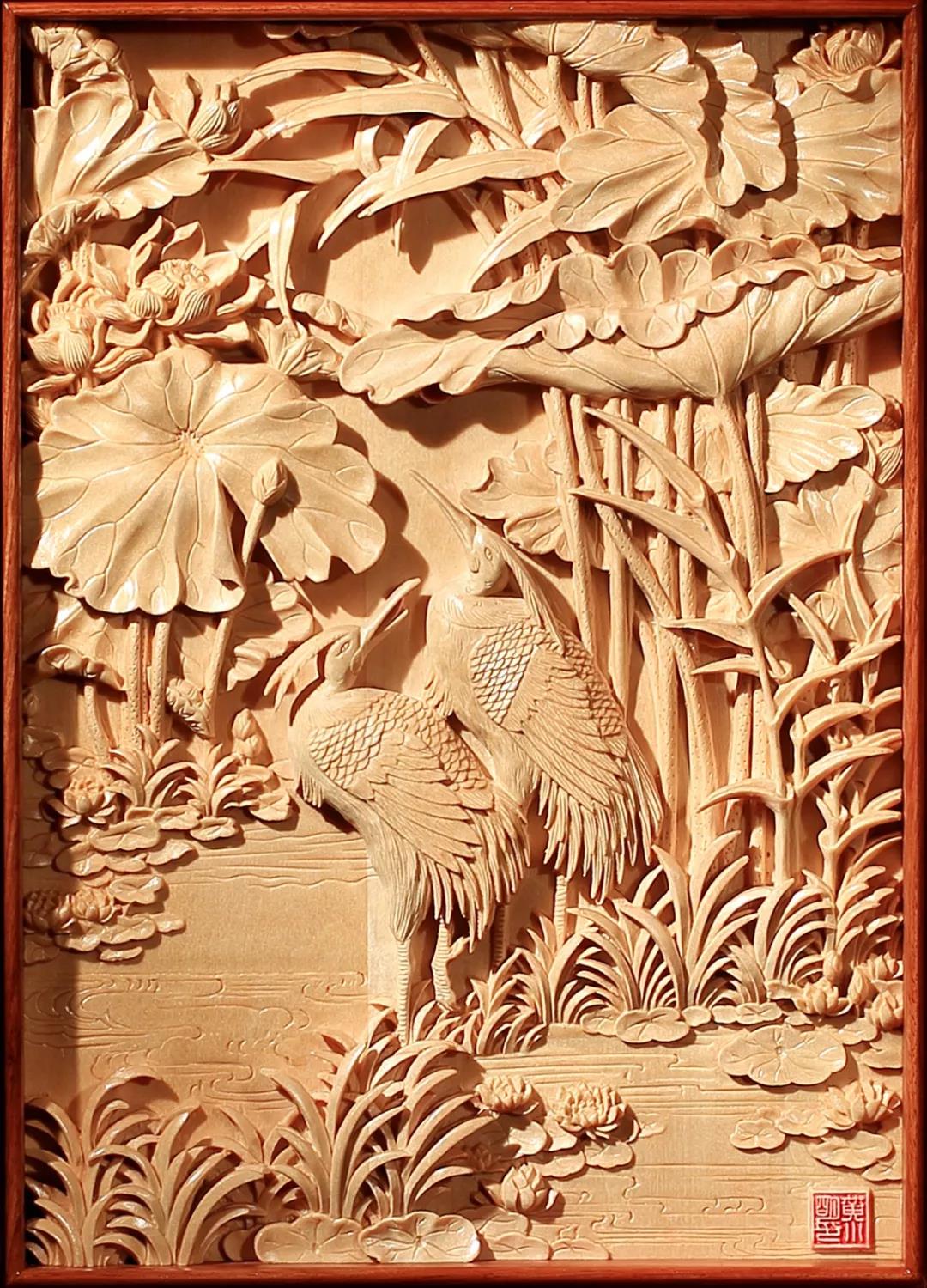雕刻了以白鹭、莲花、莲叶等构成的池塘小景,