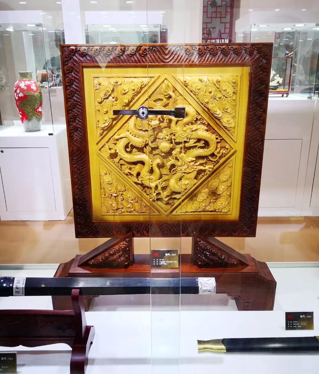 此次参展的东阳木雕作品《双龙戏珠》,以中华民族图腾之一的龙为主体元素,菱形框内,弧形波纹参差交织,双龙首尾相对,嬉戏灵珠,与框外满地雕的祥云图案构成龙腾水云间的灵动画面。