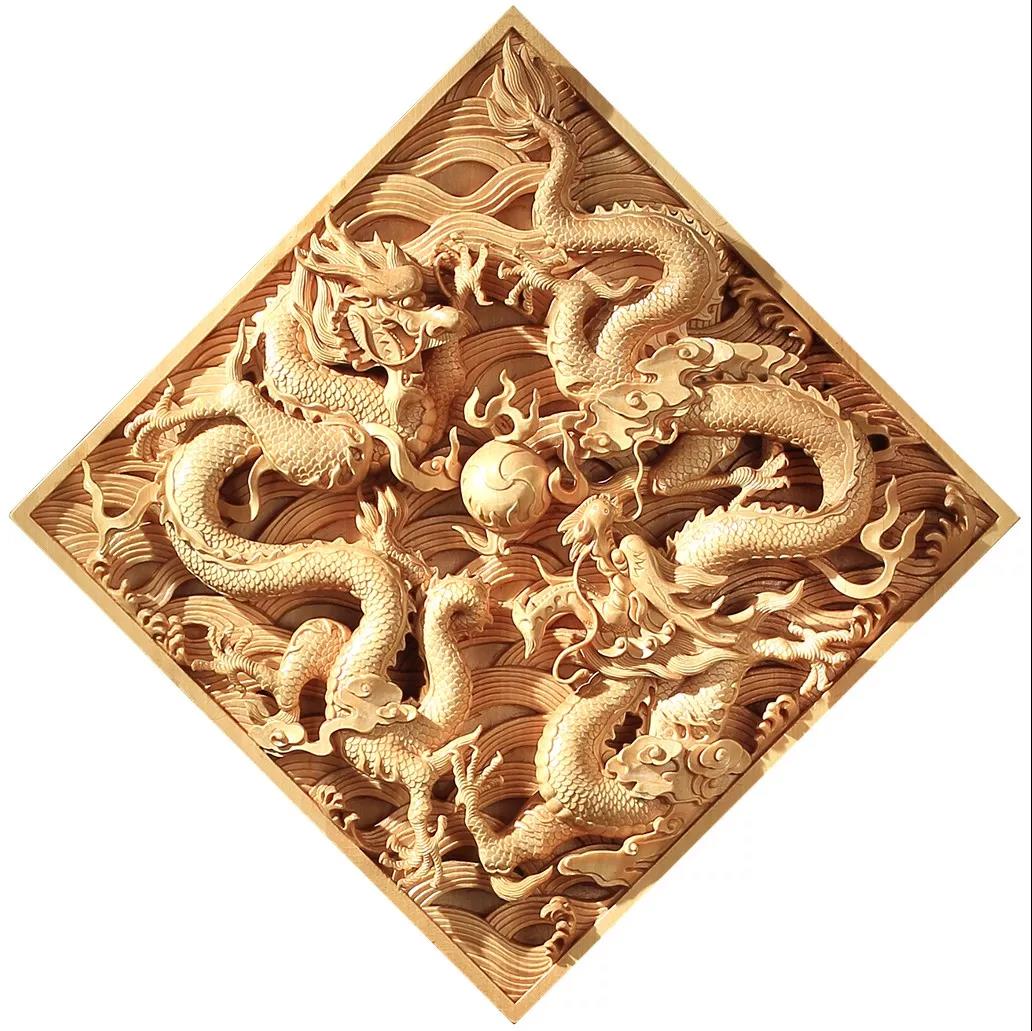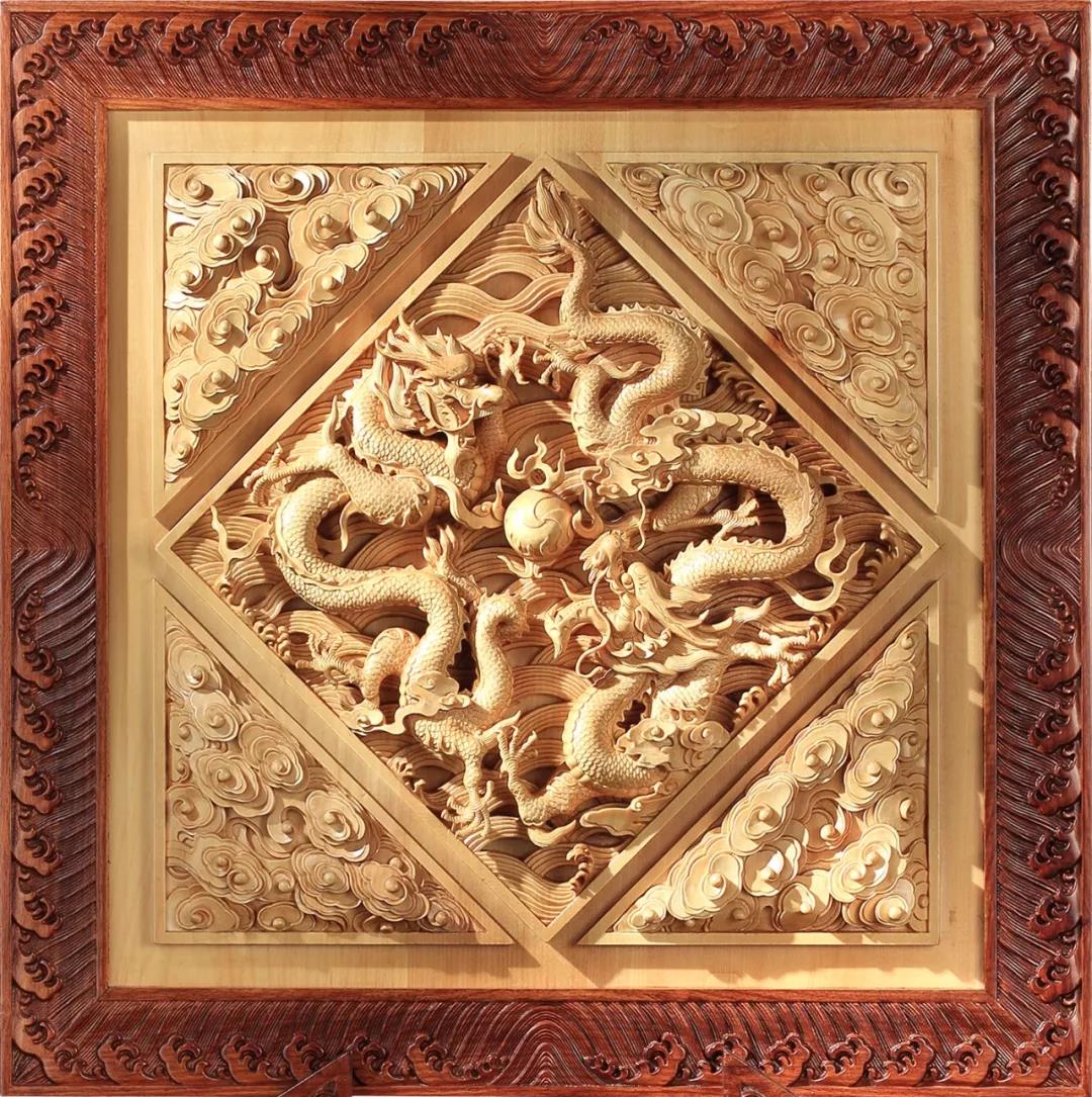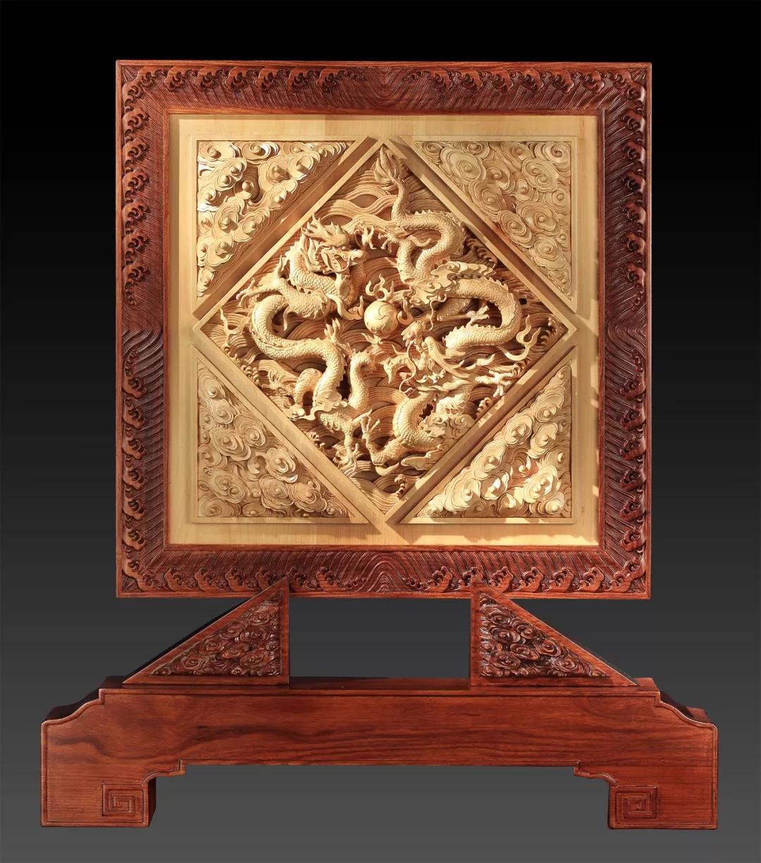 龙的形象被刻画得惟妙惟肖,动态神韵尽显东方文化之精髓所在,双龙戏珠的主题以木雕语言淋漓尽致的表达,整幅作品画面被锁定在方形台屏内,形式新颖,意境深远。
