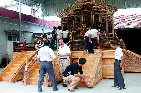 在东阳市郊一处毫不显眼的木雕厂内空地上,摆放着已经组装完成的宝座,上面罩着钢制大棚。据木工师傅丈量的数据显示,宝座连地平整体宽9.4米,长8.2米,高5.7米,没有一个车间能放得下它。