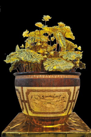 “我着迷于自己生活的这片土地与手工艺相关的一切。匠人在工房中日复一日地用时间与技艺去缔造不可磨灭的记忆力,诞生如同血脉一般的作品,让它们和自然与历史生活在一起。”正是这份对时光的尊重,对手工的敬畏,对自然与历史的亲近,使黄小明不断地把自己的感悟,注入“新东阳木雕”,成就了东阳木雕界的崭新品牌。寻常到滥俗的题材,到他的手里,总能被赋予焕然一新的格局。就如那荷花,东阳木雕艺人百般演绎,却总也逃不脱壁挂、屏风的形式,他却用木头、竹丝,雕制出一口水缸,然后把一枝枝精雕细琢并贴金的荷花,植于其中,令人称奇!荷花长于水中,是为自然;荷缸美化庭院,是为历史。把生物的自然属性与人类的造园历史结合起来,就成了黄小明的《宝月金荷》,善哉!妙哉!当然,他的创造力绝不局限于这种“小品”,占地面积达1500亩的九华山大愿文化园,其木雕装饰工程就由黄小明设计施工,成为东阳木雕建筑装饰艺术的又一典范工程。