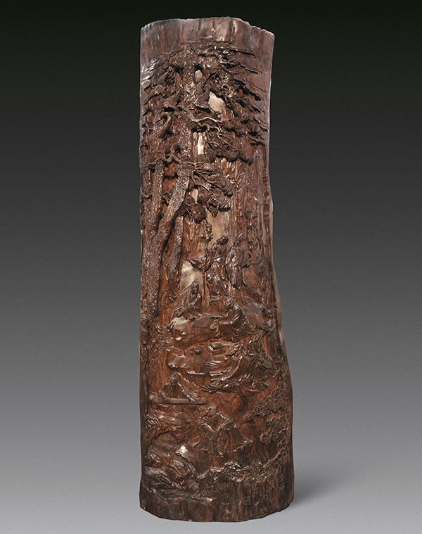 作品赏析:琴棋书画是中国传统士人最为典型而风雅的文化生活内容,也是东阳木雕的常态化表现主题。作品对这一普世价值的主题,进行了个性化艺术探索,以“树雕”形式予以表达。画面以九位老人与一名仆僮为主体,以形态各异的山石为结点,有机组合,错落有致地把老人看书、弹琴、绘画、对弈以及吟诗的情态,生动地展现在这段胸径近尺、高达米余的海黄原木上。老者或袒臂抱膝,侧耳听琴;或闭目操缦,闭目凝神;或仰视流云,品味诗书;或两两对弈,观棋不语;或策杖驻足,倾听松涛……各具情态,不一而足。近景为夭矫巨松,完美如伞,支撑起整个画面,显得散而有序,气势流畅;远景是高山鸣泉,邈远幽深。整件作品布局借鉴了明代嘉定作刻的“陷地深刻”技法,又采用了东阳木雕平面浮雕的构图与雕刻,摆脱了寻常树雕S形路径,格调高古,气韵灵动。《琴棋书画》在第三届中国浙江工艺美术博览会上获“明清居杯”特别荣誉奖。